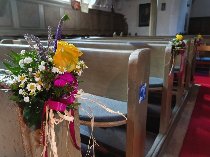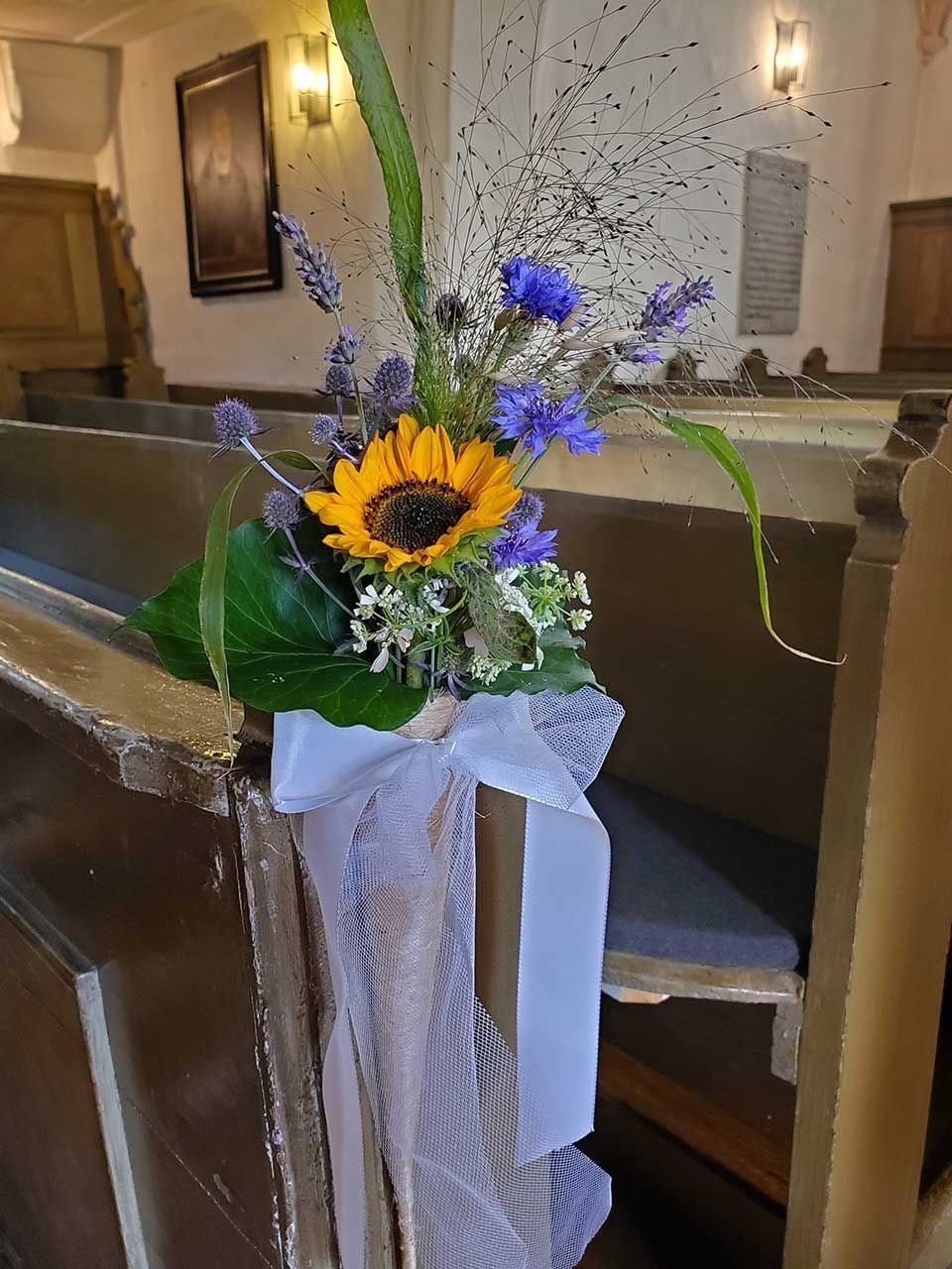 Ob Brautstrauß, Autoschmuck, florales Ringkissen, Blumen als Tortendekoration, Saaldeko und Kirchenschmuck – wir, die Pusteblume, sind Ihr zuverlässiger Partner.
